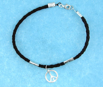 Black leather Peace Sign bracelet with a sterling silver lobster claw clasp.