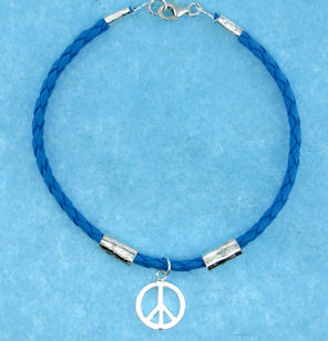 Blue leather Peace Sign bracelet with a sterling silver lobster claw clasp.