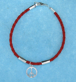 Red leather Peace Sign bracelet with a sterling silver lobster claw clasp.