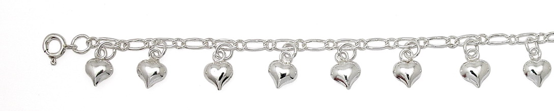 Dangling Hearts Bracelet Made of: 92.5 Sterling Silver Finish Type: High Polish Approx. Size: 7" Features intricately detailed and highly polished dangling puff hearts.