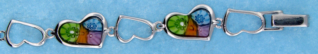 Sterling silver bracelet of our Millefiori line featuring 5 multi-color heart shape stone links with complimenting heart shape cut-out silver links.