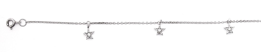 Sterling silver anklet featuring small dangling CZ stars with a rhodium plated finish, giving it a lustrous white gold appearance. We guarantee that our Sterling silver merchandise is 925 sterling or above.