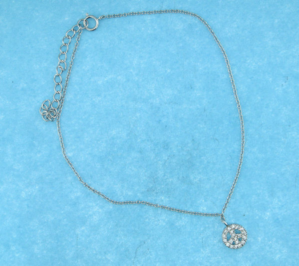 Sterling silver, fine dangling CZ peace sign anklet. Also includes a rhodium plate finish, which gives the pendant a lustrous white gold appearance and will not tarnish. All of our cubic zirconia items