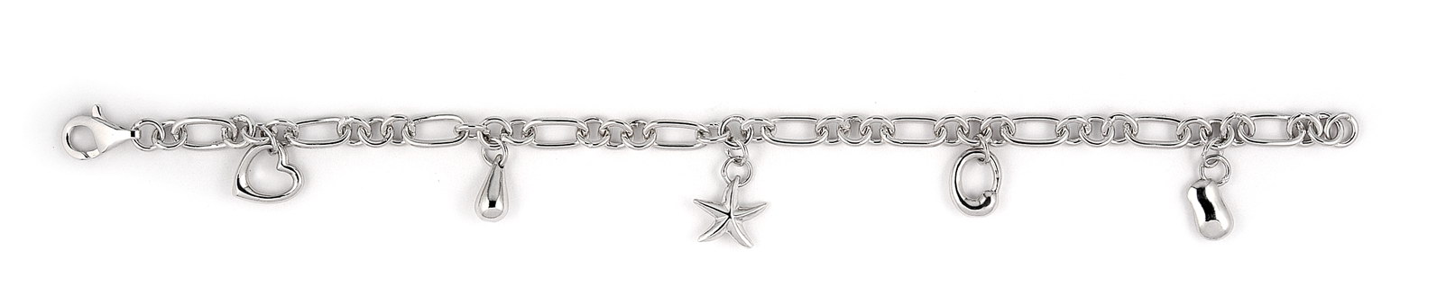 Sterling silver charm bracelet featuring 5 individually ornately detailed charms: Heart, Star and 3 Novelty Charms. Also includes a rhodium plate finish,