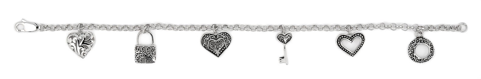 Sterling silver charm bracelet featuring 6 individually ornately detailed charms: 3 Hearts, Lock, Key, Circle. Also includes a rhodium plate finish, which gives the bracelet a lustrous white gold appearance and will not tarnish.
