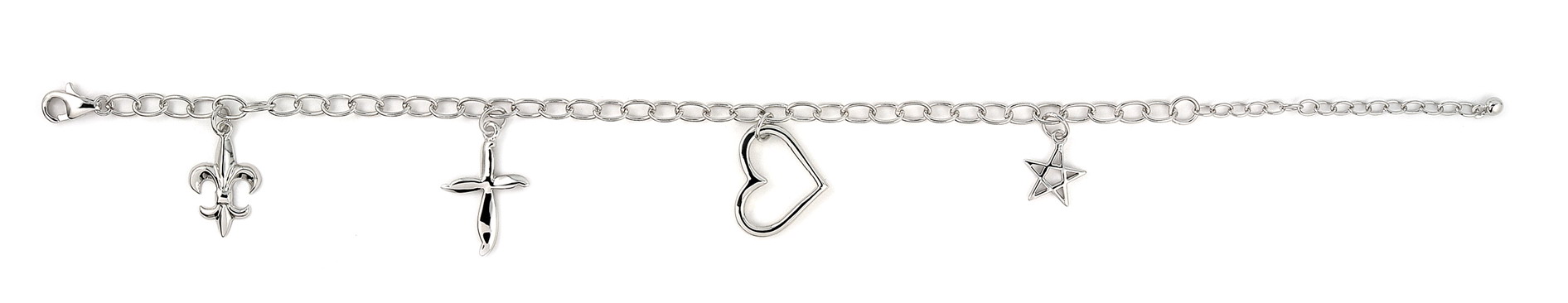 Sterling silver plain charm bracelet featuring 4 individual charms: Crest, Cross, Heart, Star. Also includes a rhodium plate finish, which gives the bracelet a lustrous white gold appearance and will not tarnish.