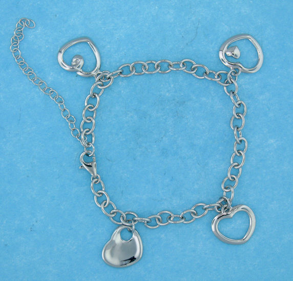 Nickel-free Sterling silver charm bracelet featuring 4 individual plain heart charms. Also includes a rhodium plate finish, which gives it its lustrous white