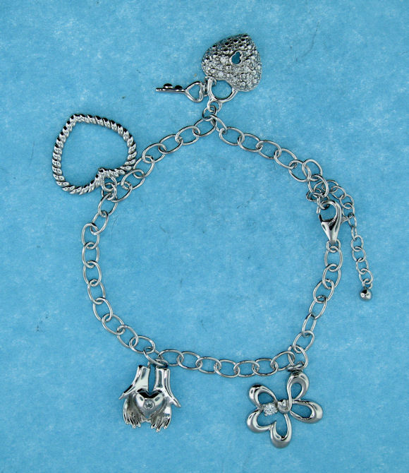 Nickel-free Sterling silver charm bracelet featuring 4 individual charms: CZ lock/key, CZ flower, Hands w/Heart, Cut-out Heart. Also includes a rhodium plate finish, which gives it its lustrous white